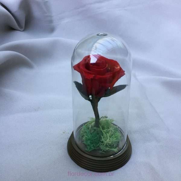Rosa Natural Preservada pequena e folhas naturais preservadas em redoma de 11 cm.