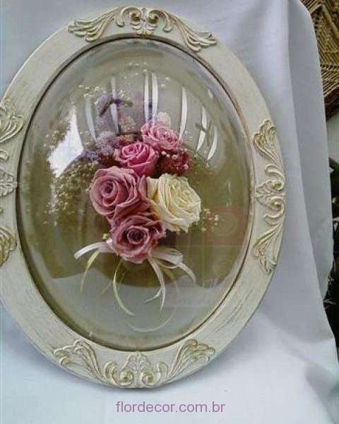 A moldura é de madeira patinada, a bolha é de acrílico e as flores são naturais preservadas e desidratadas.