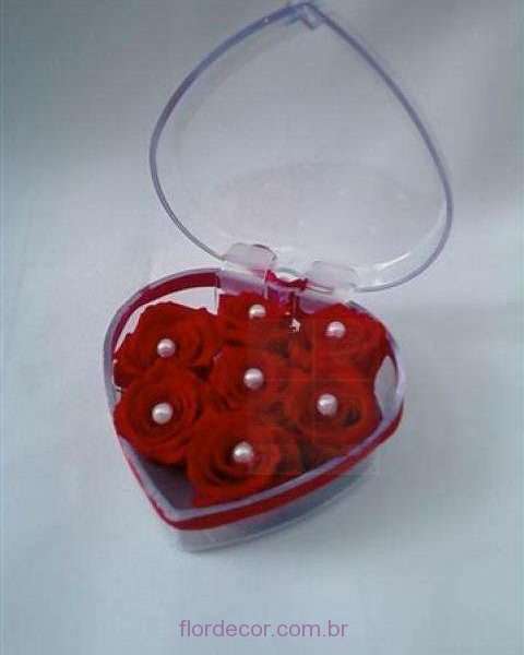 Porta-jóias de acrílico em forma de coração com 7 rosinhas naturais preservadas vermelhas de 3 cm de diâmetro cada, com uma perolazinha em cada uma. Acabamento de fita com pérola.