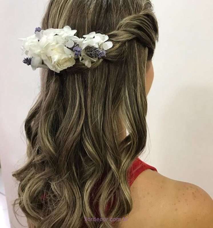 Este arranjo de cabelo com flores naturais preservadas, rosinhas, nardos e hortênsias, ganhou um colorido com raminhos de lavanda que “conversaram” com o buquê de lavanda desidratada que preparamos para a Isadora Vetorazzo.