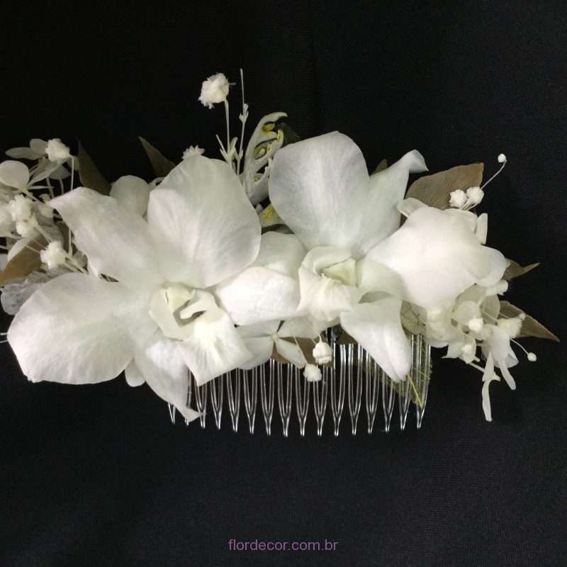 Este lindo pente de flores naturais preservadas composto de orquídeas dendrobium brancas e folhas foi feito especialmente para a Mariana Pagnan Silva de Faria, que também fez o buquê conosco.