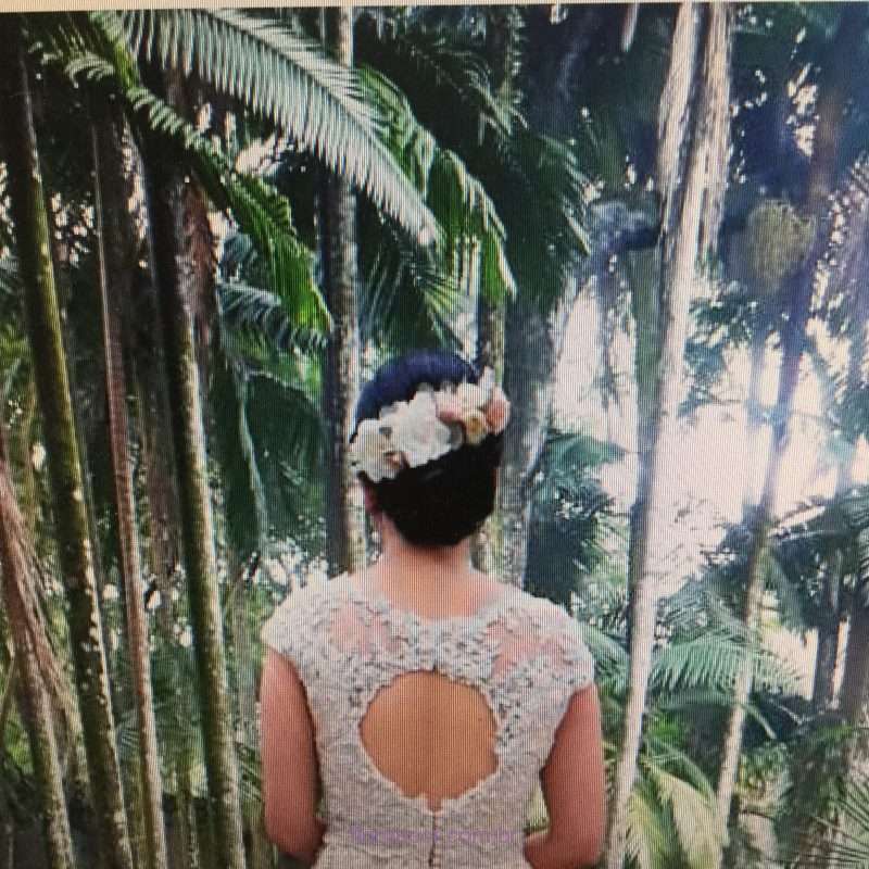 Pente com gardênias, rosas nude, rosas off white e folhas naturais preservadas feito especialmente para Bianca Alencar Cruz.