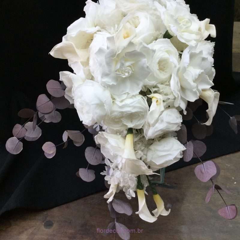 Este buquê clássico e chique em forma de cascata pequena foi feito com rosas inglesas ou rosas de jardim, mini callas ou mini copos de leite e gardênias brancas, todas naturais preservadas, assim como a folhagem.