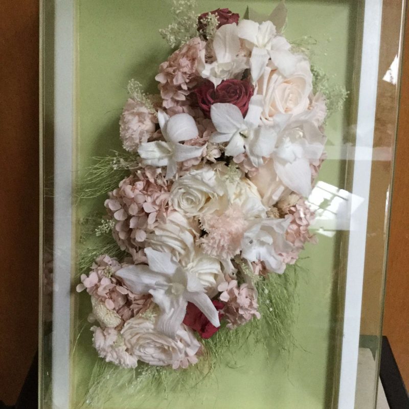 Este é o buquê de flores preservadas da Viviana Macedo, que nos trouxe depois do casamento para colocar na moldura. Ficando assim protegido, ele vai durar muito mais tempo!