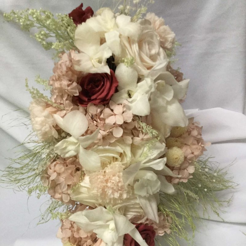 Este lindo buquê ou bouquet de flores preservadas em cascata composto de orquídeas, rosas marsala e cravos porcelana, foi feito para a Viviana Macedo.