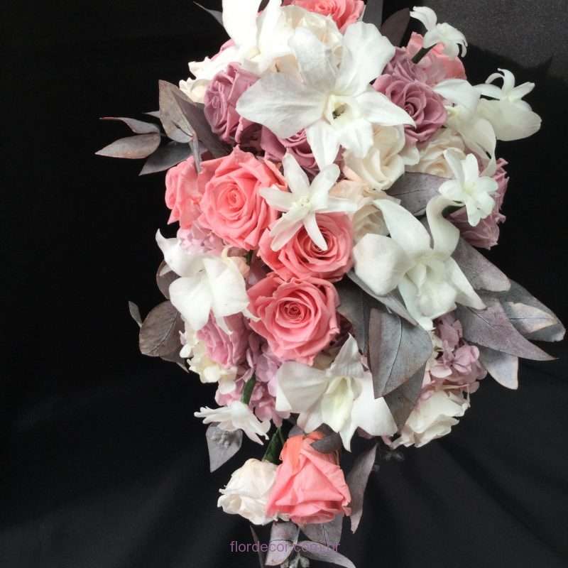 Buquês de flores preservadas podem também ter o formato de cascata. Este buquê de rosas, orquídeas, nardos e hortênsias, nós fizemos especialmente para a Marina del Nero Ferreira.