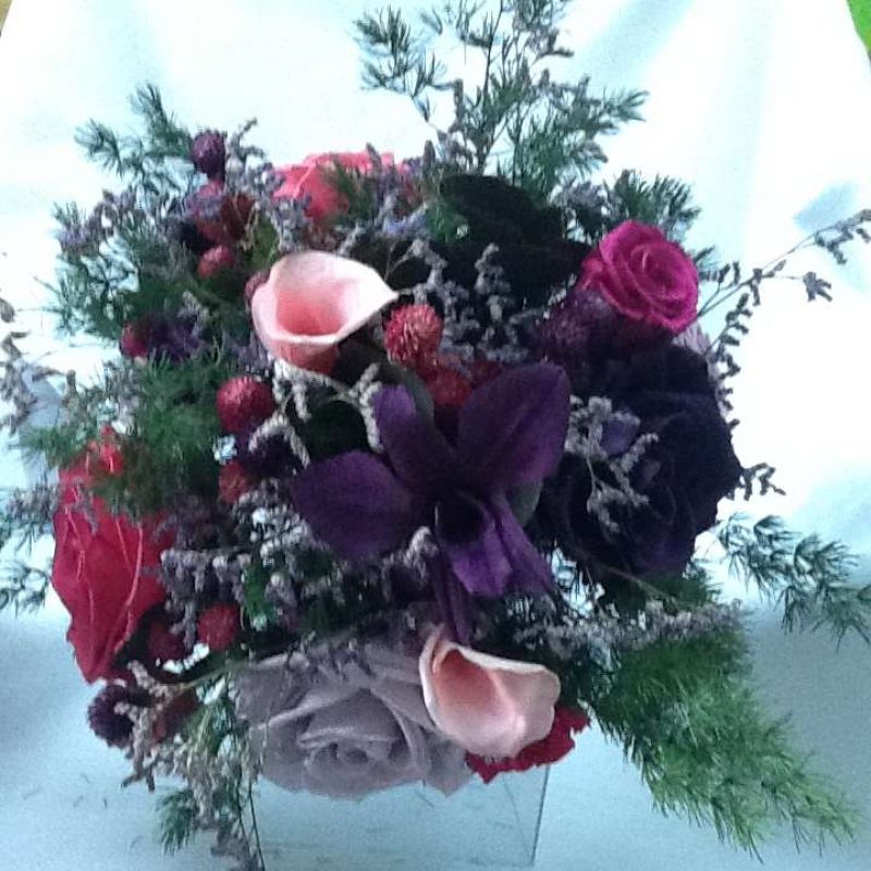 Este buquê de noiva de flores e folhagens preservadas para Daniella Albino Bezerra, foi feito para parecer que acabaram de colher as flores. É composto de 5 rosas premium (inclusive negras), 3 rosas médias, 2 rosas baby, 2 mini callas cor de rosa, estatice, eucalipto, aspargos, perpétua roxa e 1 dendrobium roxa.