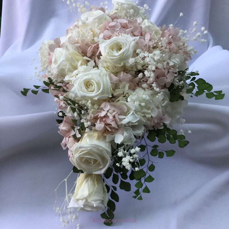 Buquê ou bouquet de flores NATURAIS preservadas no formato “cacho de uva”, com hortênsia branca e nude, rosas brancas e avencas também preservadas feito para Suzana Junqueira Franco.