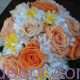 Este buquê de noiva de flores preservadas em formato de cascata pequena, tem rosas médias off white, rosas standard turquesa, rosas médias bicolor, orquídeas catleya pequenas brancas preservadas e orquídeas dendrobium turquesa desidratadas. Foi montado para a Feira Casar 2014.