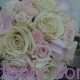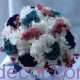 Este buquê de noiva de flores preservadas tem como base hortênsia branca e rosas médias turquesa e cor de rosa.