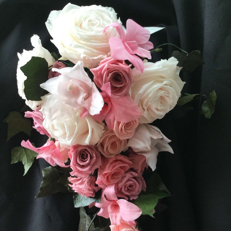 Este buquê ou bouquet de flores preservadas composto de rosas, orquídeas e folhas de hera em cascata, foi feito para a Fernanda Fernandes.