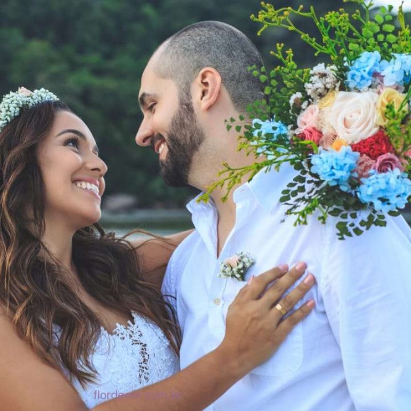 Este buquê de flores preservadas desconstruído foi inspirado numa foto enviada pela noiva Amanda Andrade, que queria um toque de azul para dar sorte.