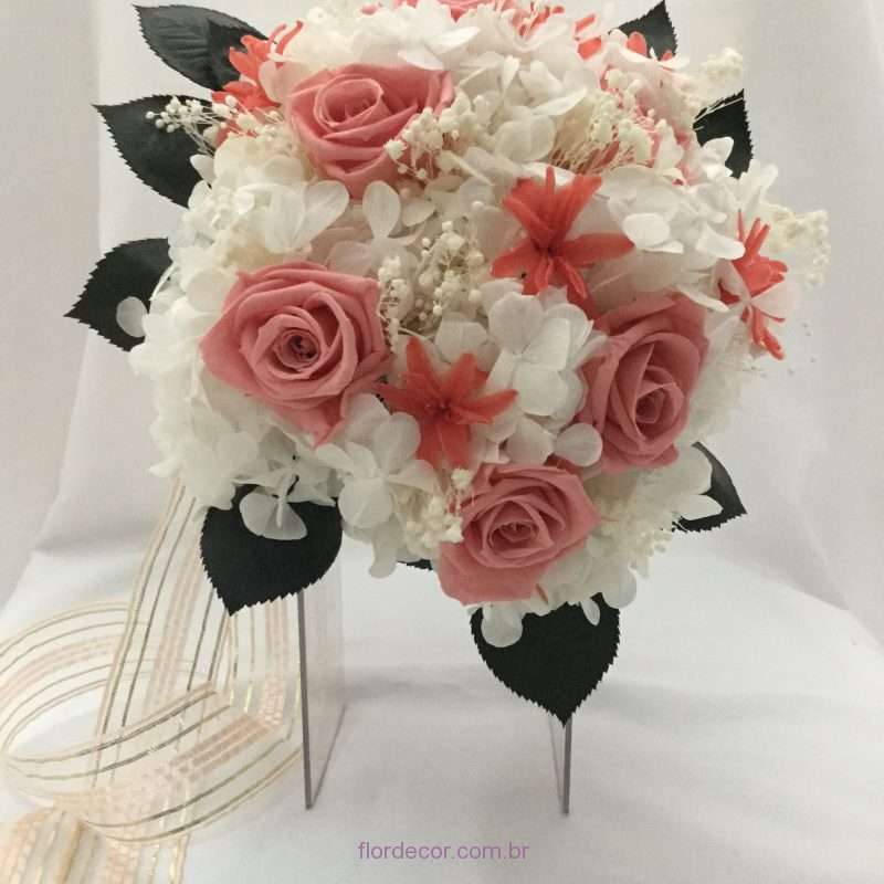 Buquê de flores NATURAIS preservadas de hortênsia branca, rosas médias e nardos em tom de rosa coral e saia de folhas para Cibele Vieira.