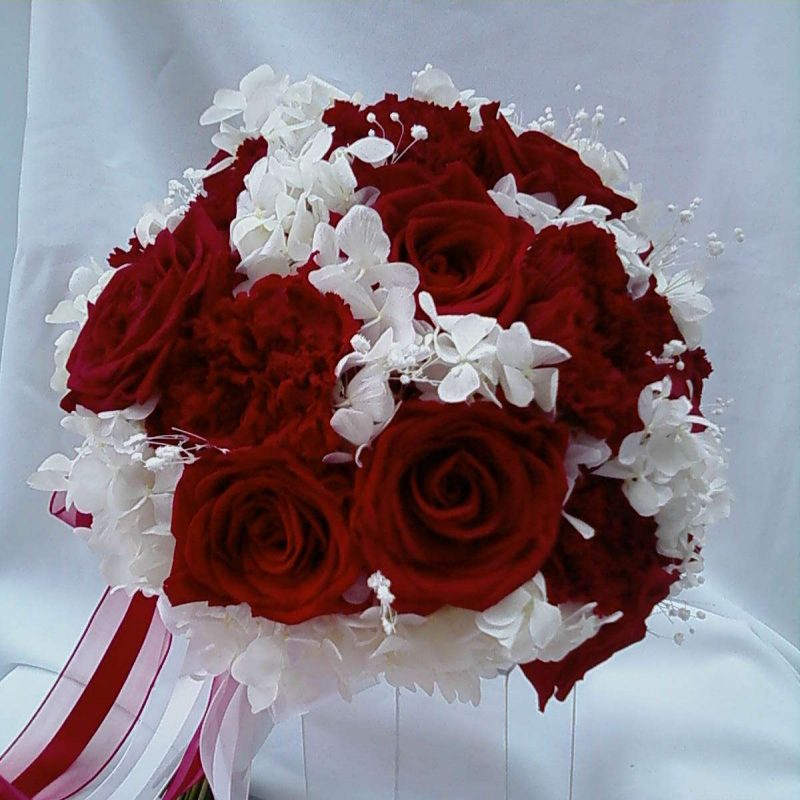 Este buquê de flores preservadas é composto de cravos e rosas vermelhas, entremeados de hortênsia branca e foi feito para Pâmela Benesby.