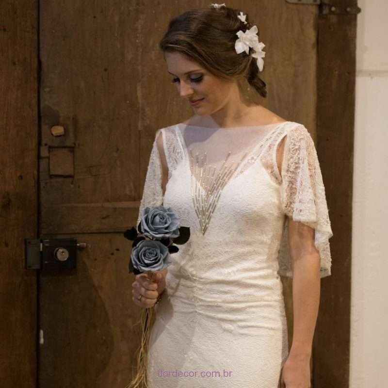 Buquê original de flores preservadas icey blue e orquídeas preservadas no cabelo.