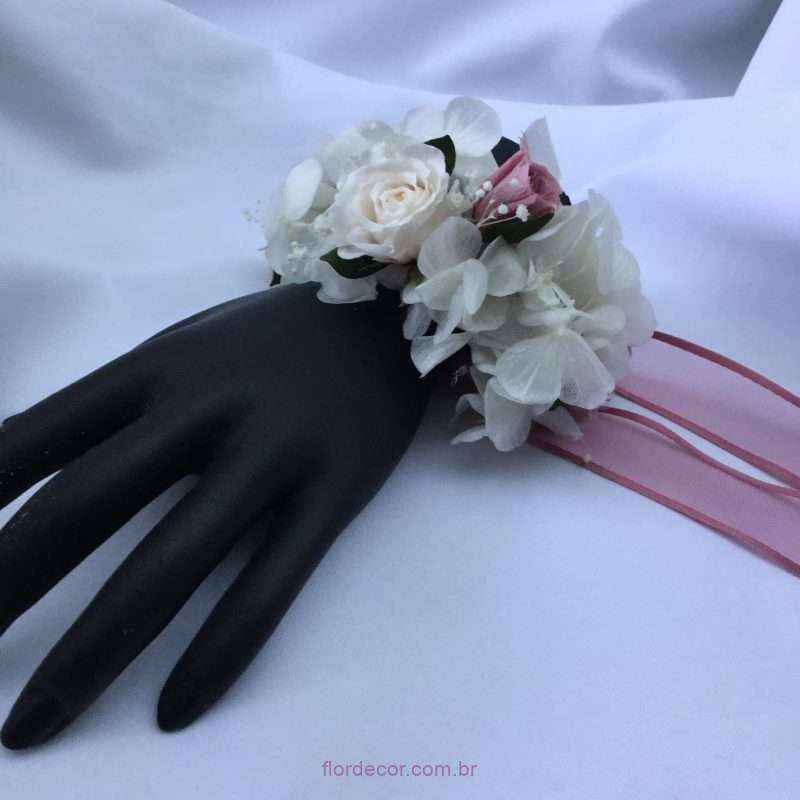 Este corsage (pulseira de flores naturais preservadas) foi feito especialmente para a Cláudia Dantas