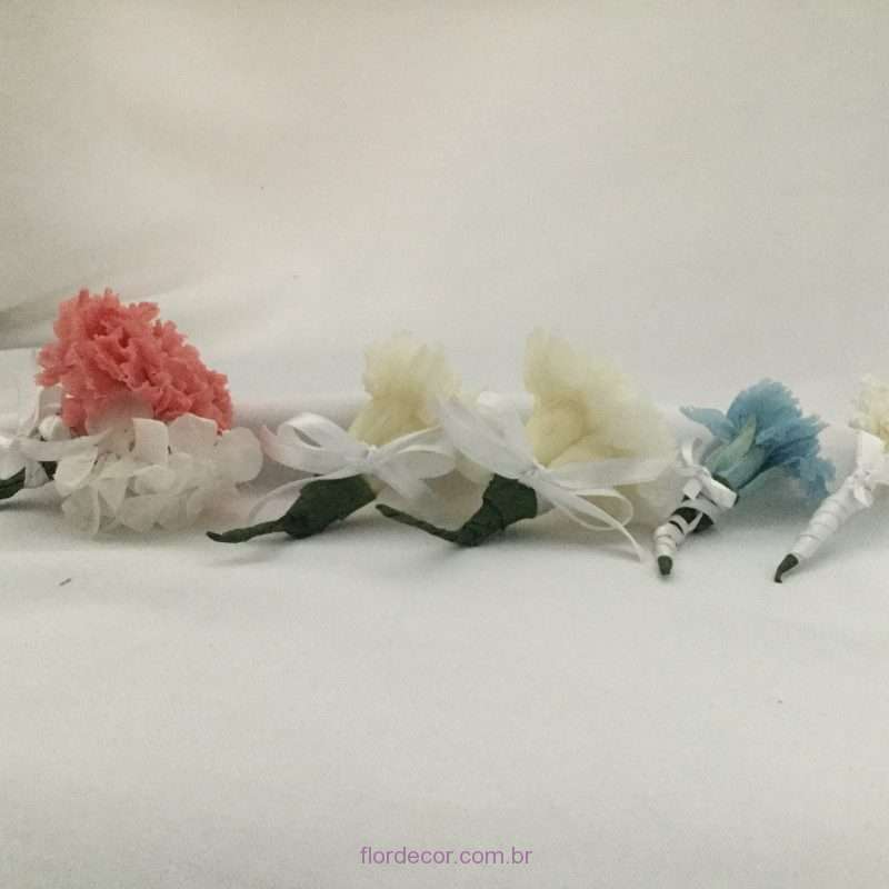 Os cravos brancos, também naturais preservados foram para os pais. O mini-cravo azul claro foi para o terninho do pajem e as lapelas de mosquitinhos preservados foram feitas para os padrinhos.