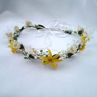 Guirlanda de mosquitinhos brancos nardos amarelos e rosinhas brancas preservadas coroa